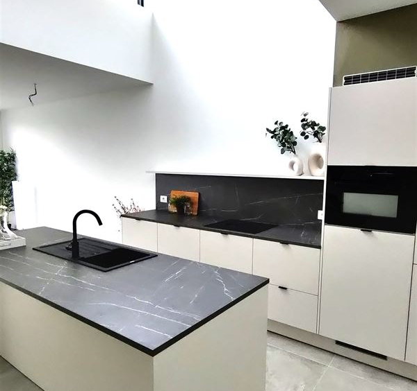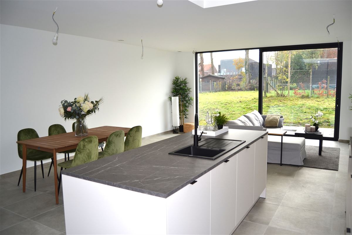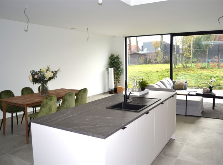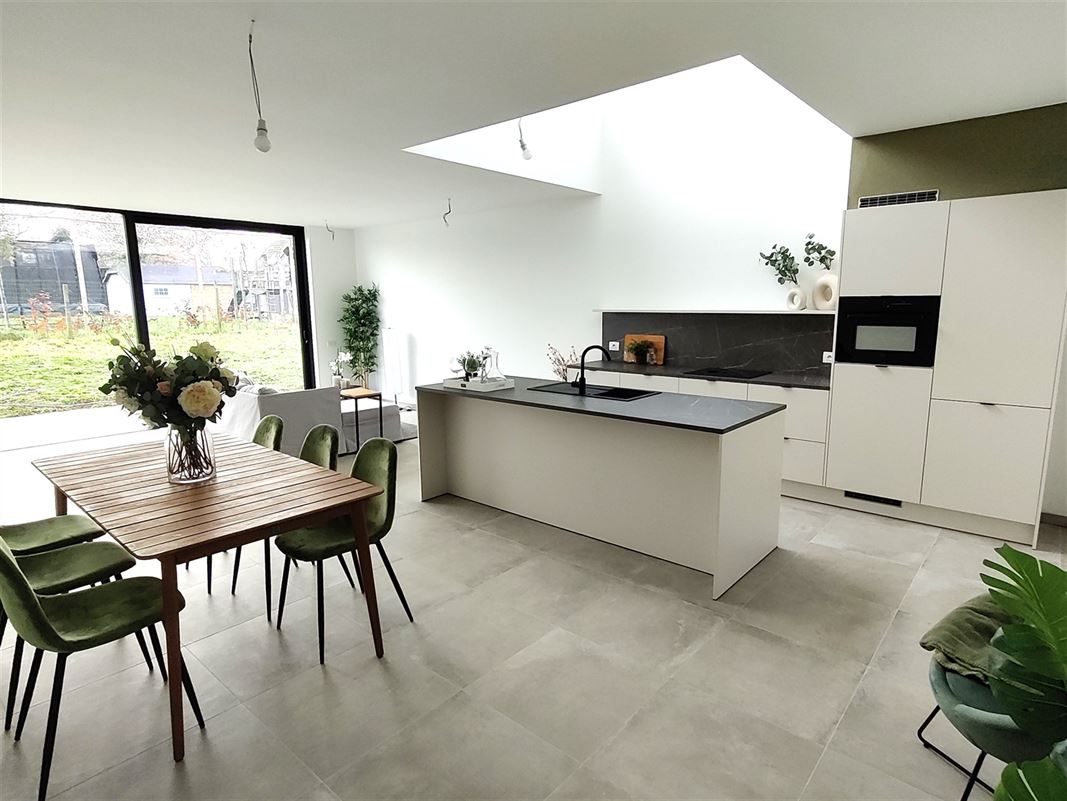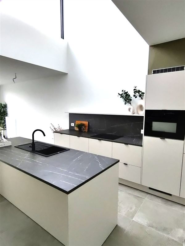 We betreden de woningen via de ruime inkom met plaats voor vestiaire. Zo komen we in de ruime en lichtrijke leefruimte. Dankzij een vide boven de keuken, komt het daglicht steeds goed tot zijn recht. Dit zorgt samen met het grote schuifraam ook voor een spectaculair ruimtegevoel. Er werd gekozen voor een kwalitatieve keuken met kookeiland en hoogwaardige materialen. Bij tijdige beslissing kan bovendien rekening gehouden worden met uw persoonlijke voorkeuren om de keuken nog meer aan te passen aan uw smaak.