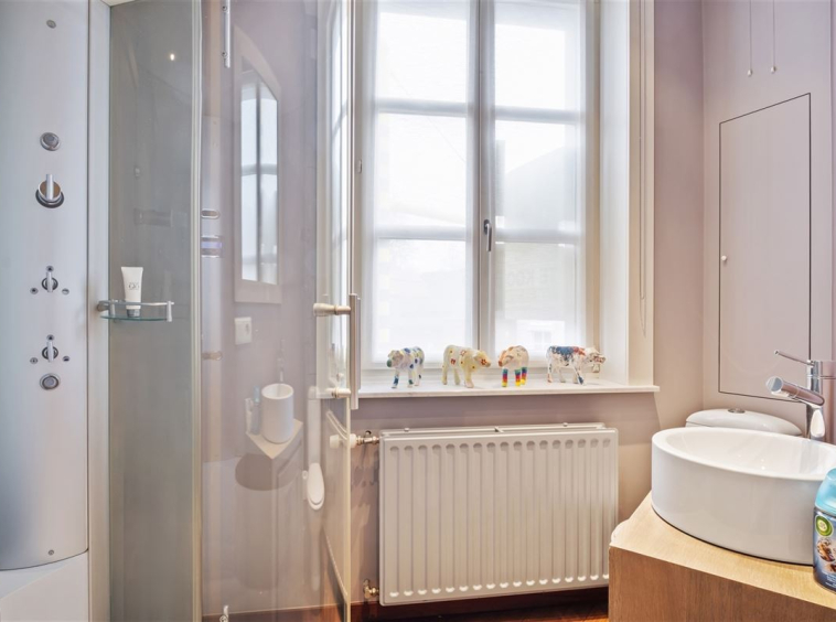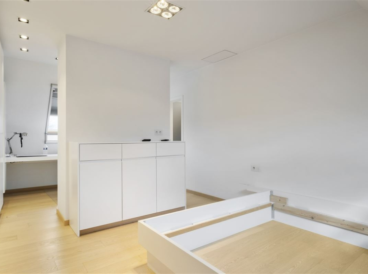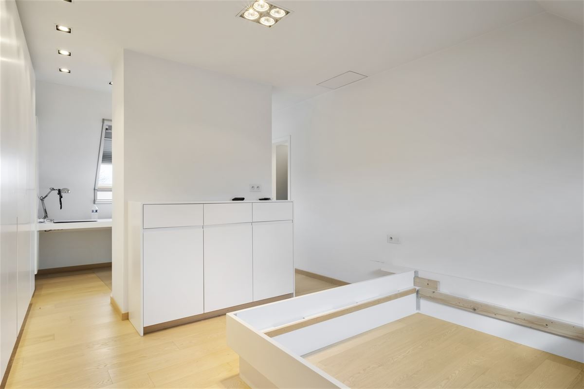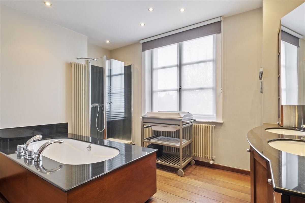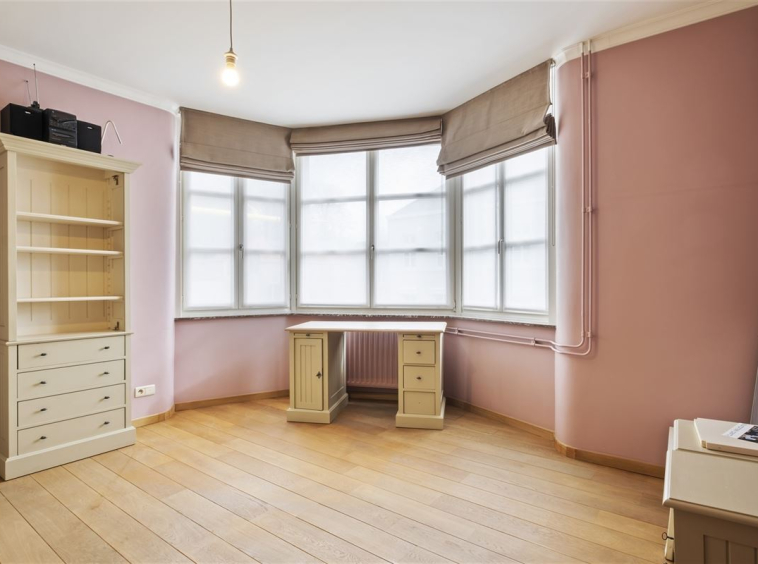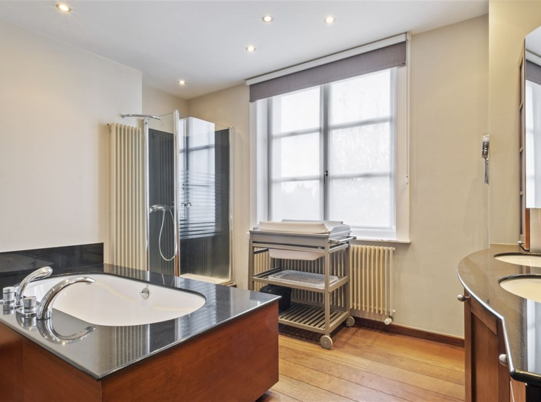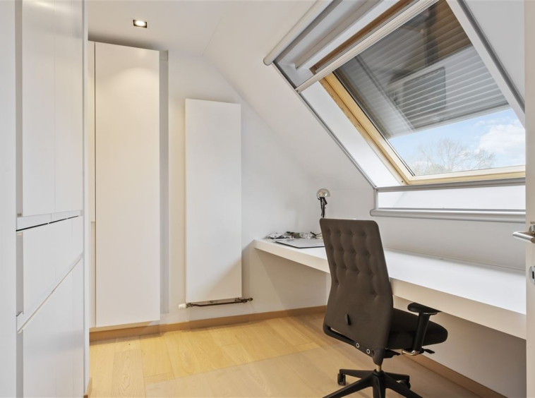 Via een gerestaureerde eiken trap bereiken we de eerste verdieping met drie ruime slaapkamers, waaronder een masterbedroom met erker en een luxueuze badkamer met losstaand bad, douche en dubbele lavabo. Een tweede badkamer met douche, toilet en wastafel vervolledigt deze verdieping. De tweede verdieping biedt nog twee slaapkamers, elk uitgerust met een eigen bureau en inbouwkasten.